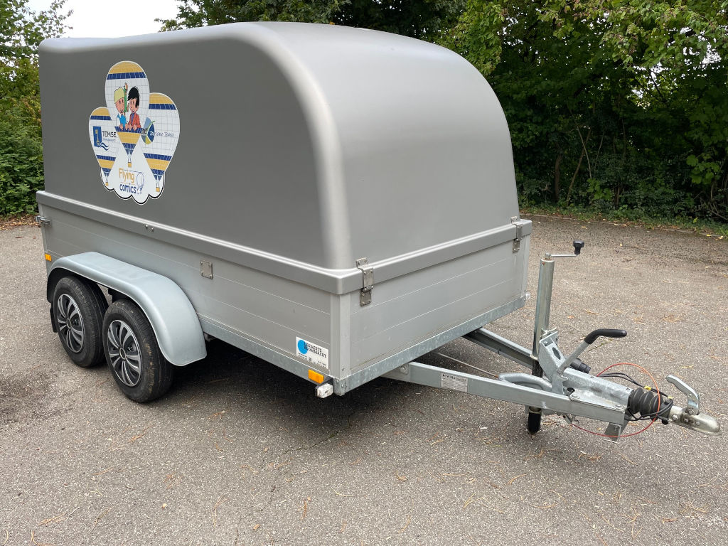 Single axle trailer with grey PVC cover, license plate 570 FVK 92.