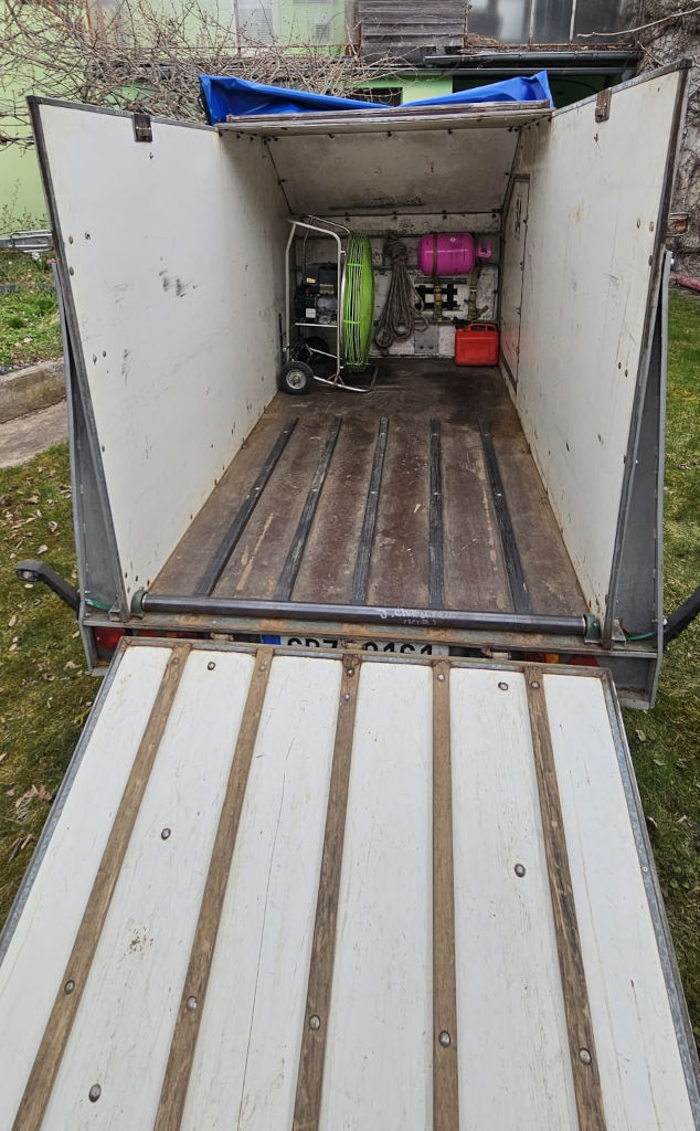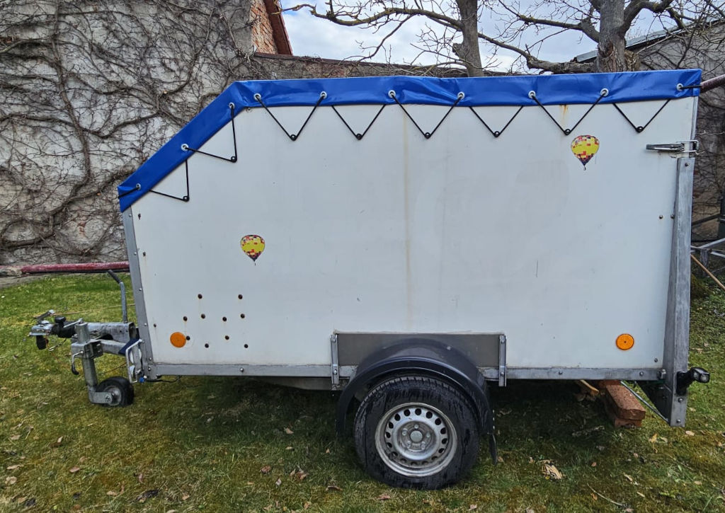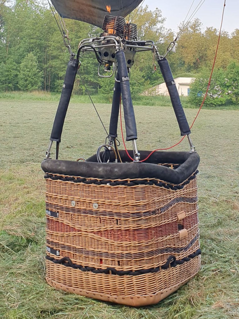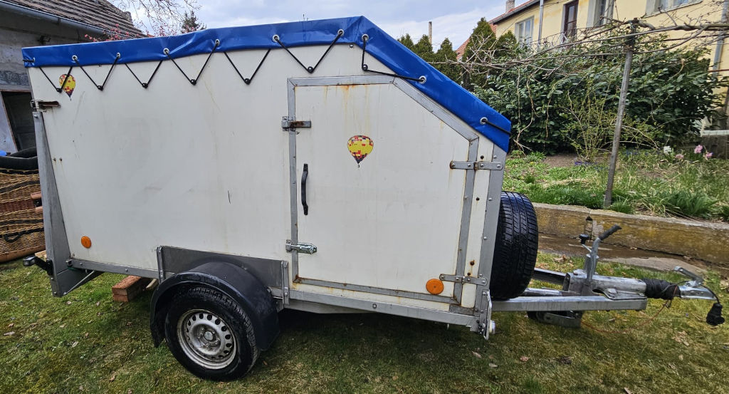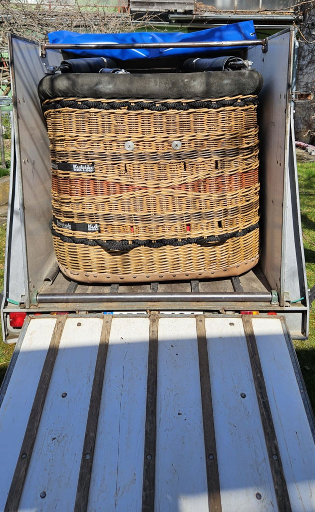 Aerotechnik J1 basket, built 1991, 450 hrs. Dimensions 1.16m x 1.16m. Black suede top rim, first aid kit, fire extinguisher, fire blanket, drop line. Steel cables damaged but officially deemed airworthy by CAO. Foldable uprights. Kubicek HB2 double burner, built 1997, vapour pilot lights, REGO fittings, hoses dated 03/2019. 2x Thunder & Colt V30 cylinder, built 1987, master, quick shut off valve, REGO fitting, red cover. PRV/PPT/INT valid until 08/2033. 6.0 HP inflation fan, stainless steel flip wheel frame, wooden propeller. Agados VZ-21 single axle trailer, built 1998, overrun brake. Max total weight 750 kg. With side door, fan mount, spare wheel.