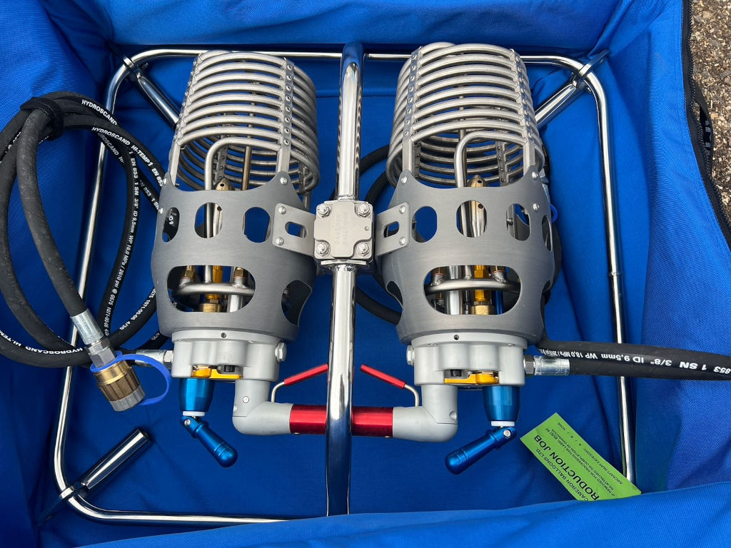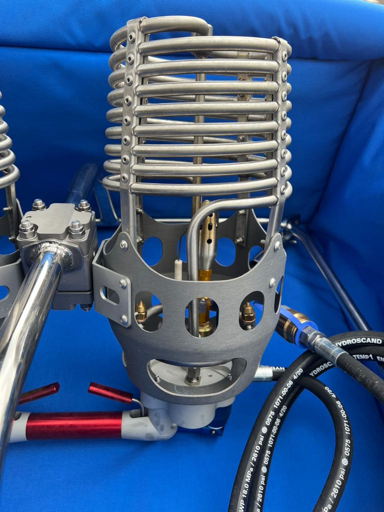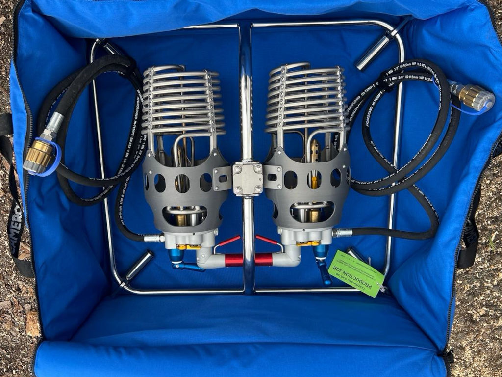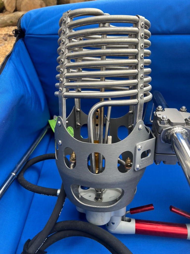 Cameron Stratus Neo Mini double burner, built 2024, 4 flights, 5 hrs. Liquid pilot lights, REGO fittings, in lightweight frame. Total weight 18 kg, certified up to envelope size 140.000 ft3. Burner bag not included.